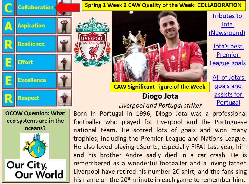 Each week we look at a different Significant Figure, and reflect on how they have embodied our six Growth Mindset CAW Qualities. This week, for example, we’ve celebrated Diogo Jota and the Collaboration/Teamwork Termite qualities he showed throughout his career.