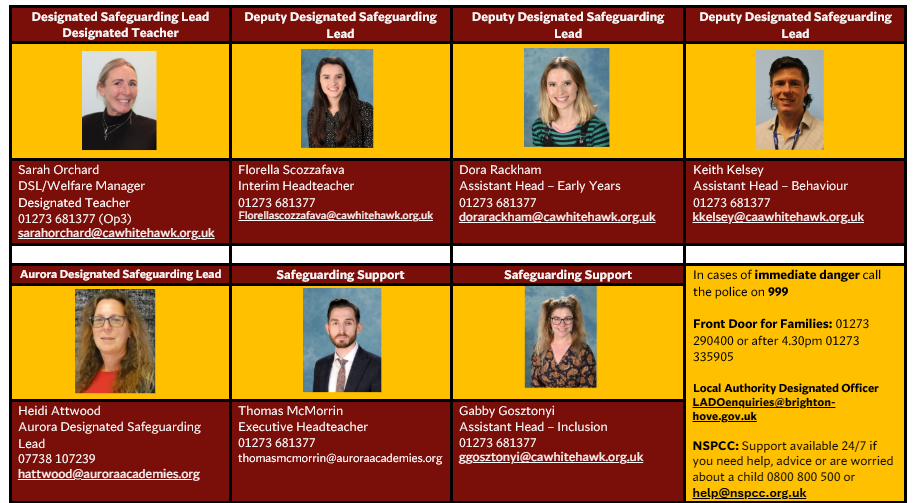 City Academy Whitehawk has dedicated, trained members of staff who work to safeguard our children. If you have concerns about a child during term time, please contact our Designated Safeguarding Leads.
